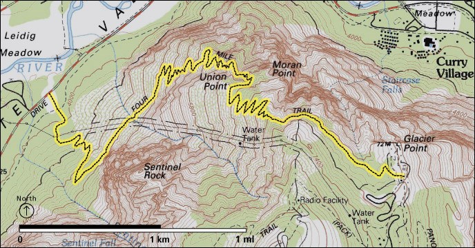 - Views: Glacier Point, Illilouette Falls, Nevada Falls, Vernal Falls, Panorama Point, Royal Arches, North Dome, Half Dome